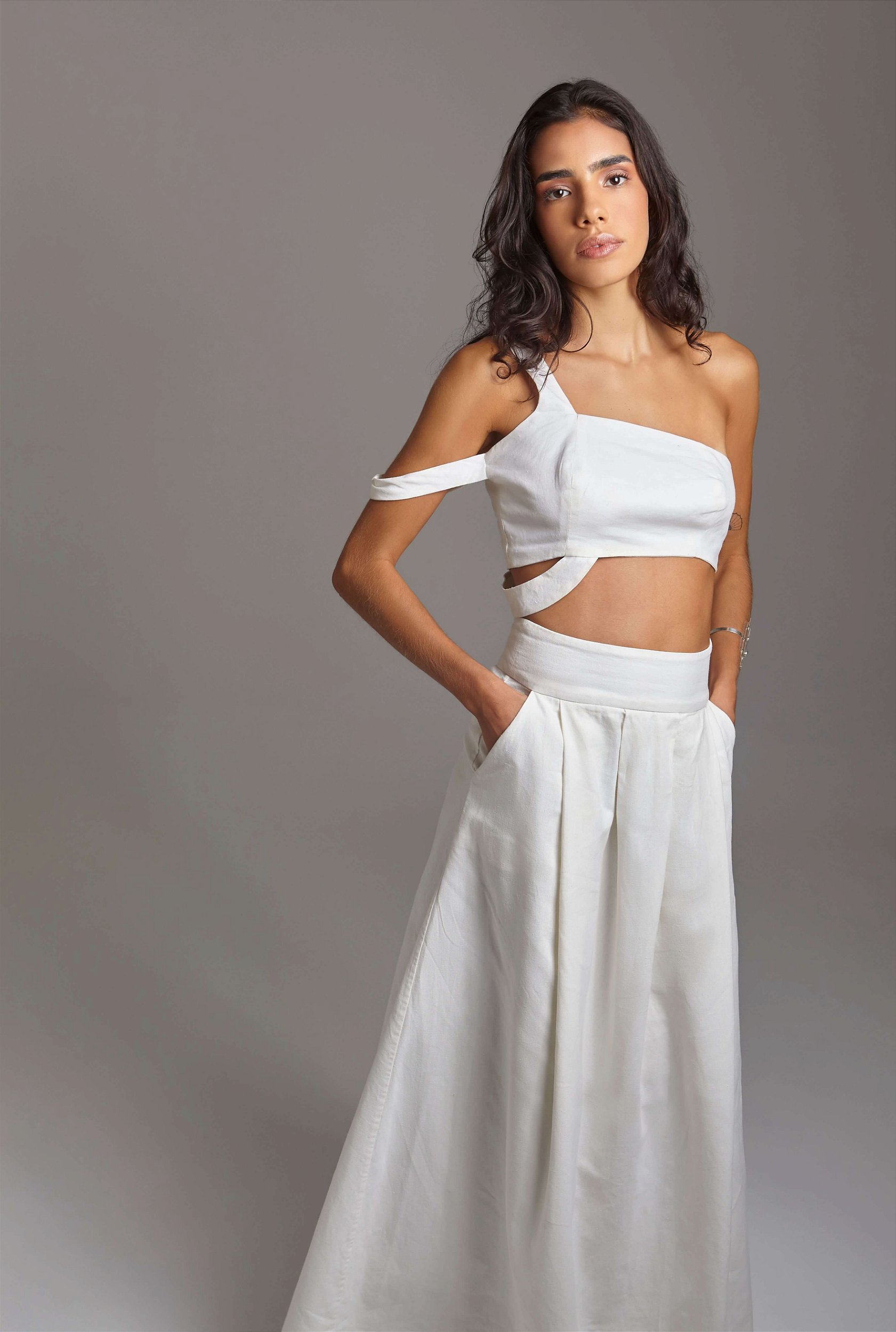 Top assimétrico, produzido com tecido duplo que não marca o seio. Possui fechamento com zíper lateral e tiras em recortes estratégicos, tornando essa peça singular e cheia de personalidade.